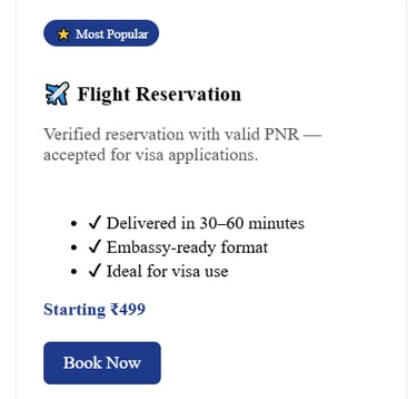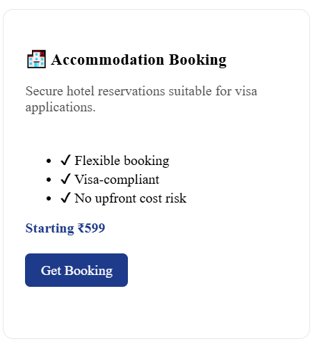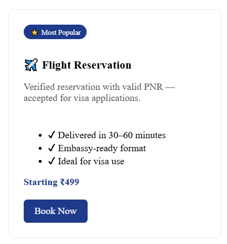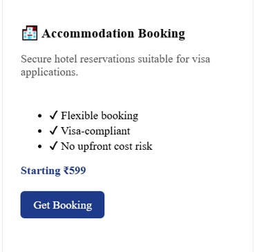 Our services include verified flight reservations, accommodation bookings, and travel insurance for visa applications. We also provide assistance with financial and supporting documents such as ITR, CA reports, valuation reports, and other essential requirements by our recognized and Government Approved Charted Accountant / Lawyer.